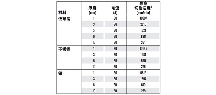 最大切割速度是根據(jù) Hypertherm 實驗室測試所得的結(jié)果。為達到最佳切割性能,各種切割應用的實際切割速度可能有所不同。有關(guān)更多詳情,請參考《操作源手冊》。
